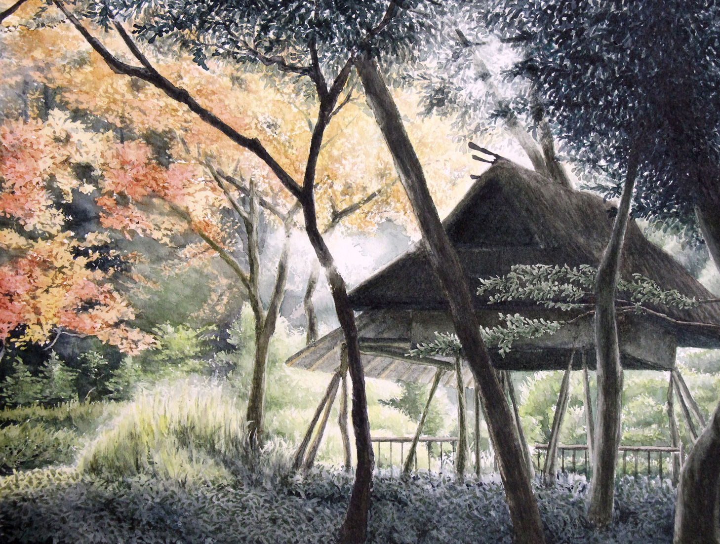 季節はずれですが、六義園内にある「つつじ茶屋」付近の風景を透明水彩で描きました。